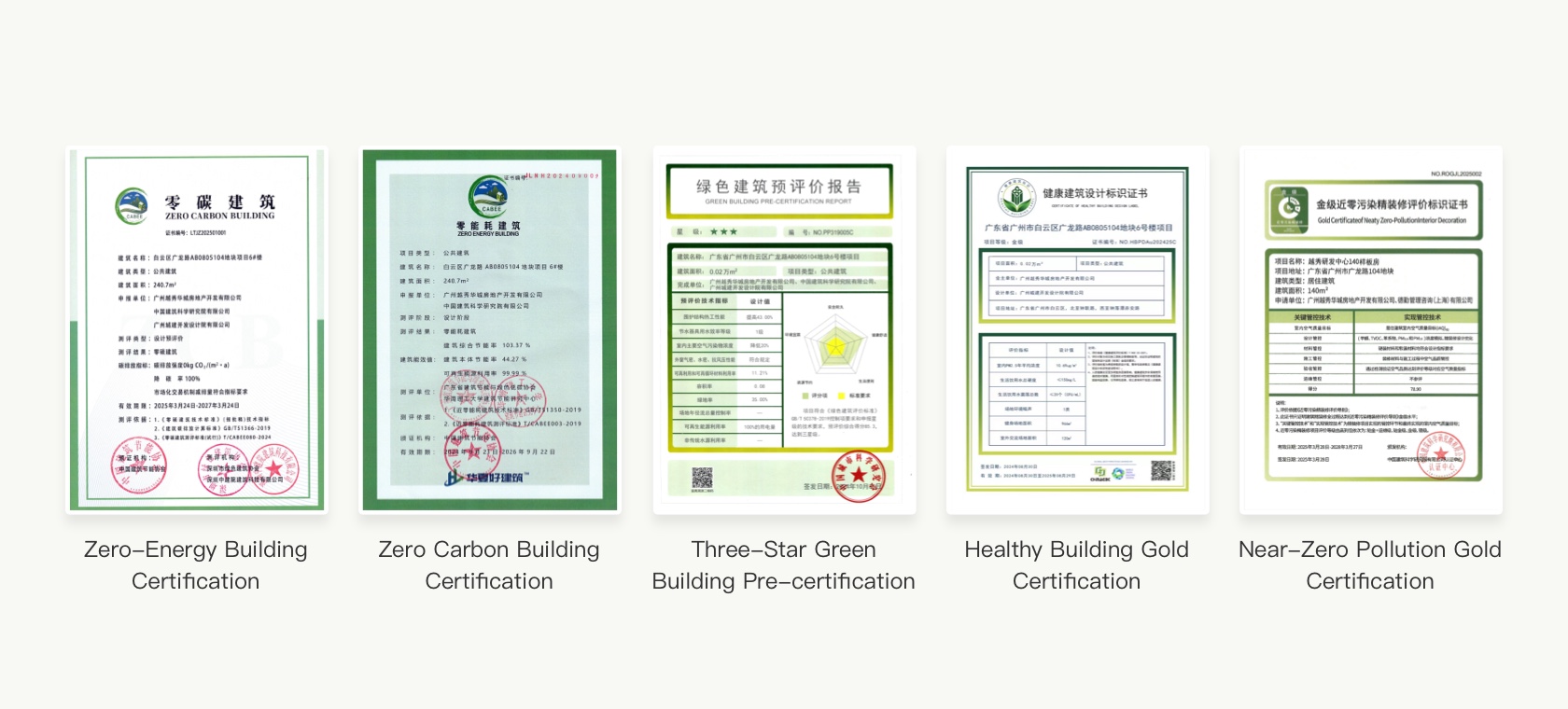 Apart from being the first near-zero pollution finishing pilot project in China, the Yuexiu Property R&D Centre is also the first project in China to obtain all four relevant certifications, namely Zero Carbon Building Certification, Zero-Energy Building Certification, Three-Star Green Building Pre-certification, Healthy Building Gold Certification and Near-Zero Pollution Certification - Gold, in the country. Adopting the principle of “priority for passive design, active optimisation of design, and using renewable energy”, Yuexiu Property's “Dual Zero” Exhibition Hall has developed a “2+3+11” technical system - encompassing “2 pathways + 3 modules + 11 technologies” - to help it achieve the company’s Zero-Energy Building target. The project’s annual operational carbon emissions per unit area is -13.27 kg/CO₂/(m²·a), boasting a carbon reduction rate of 125%, achieving the negative carbon target and fulfilling the requirements for a zero-carbon building.Detailed project descriptions can be found on the project webpage.