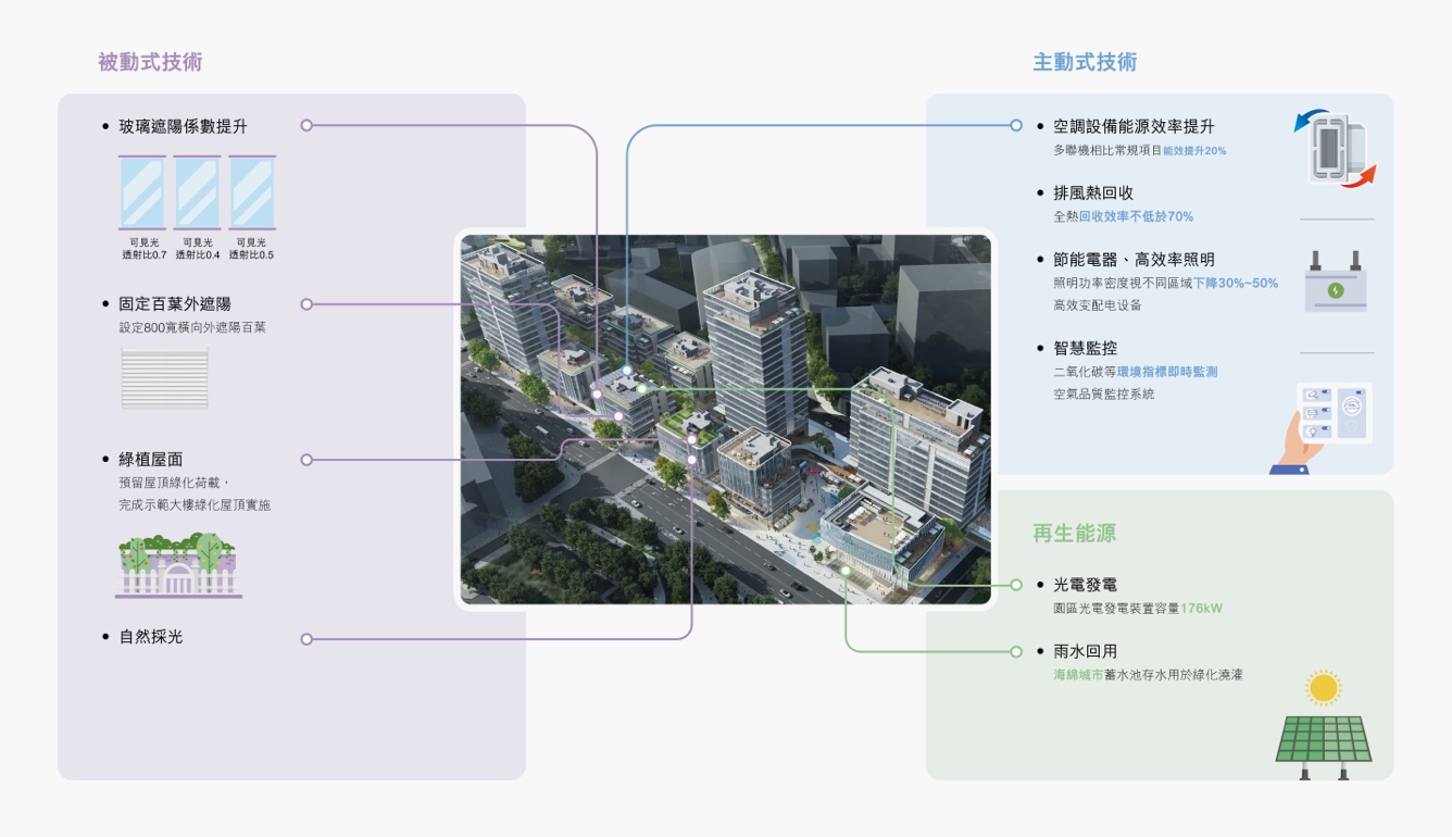 - 太阳能光伏发电:通过幕墙设置水平外遮阳光伏铝板,屋面铺设176kW容量光伏发电装机,年供应电量可达19万kW·h,满足D6#电力自产自用。