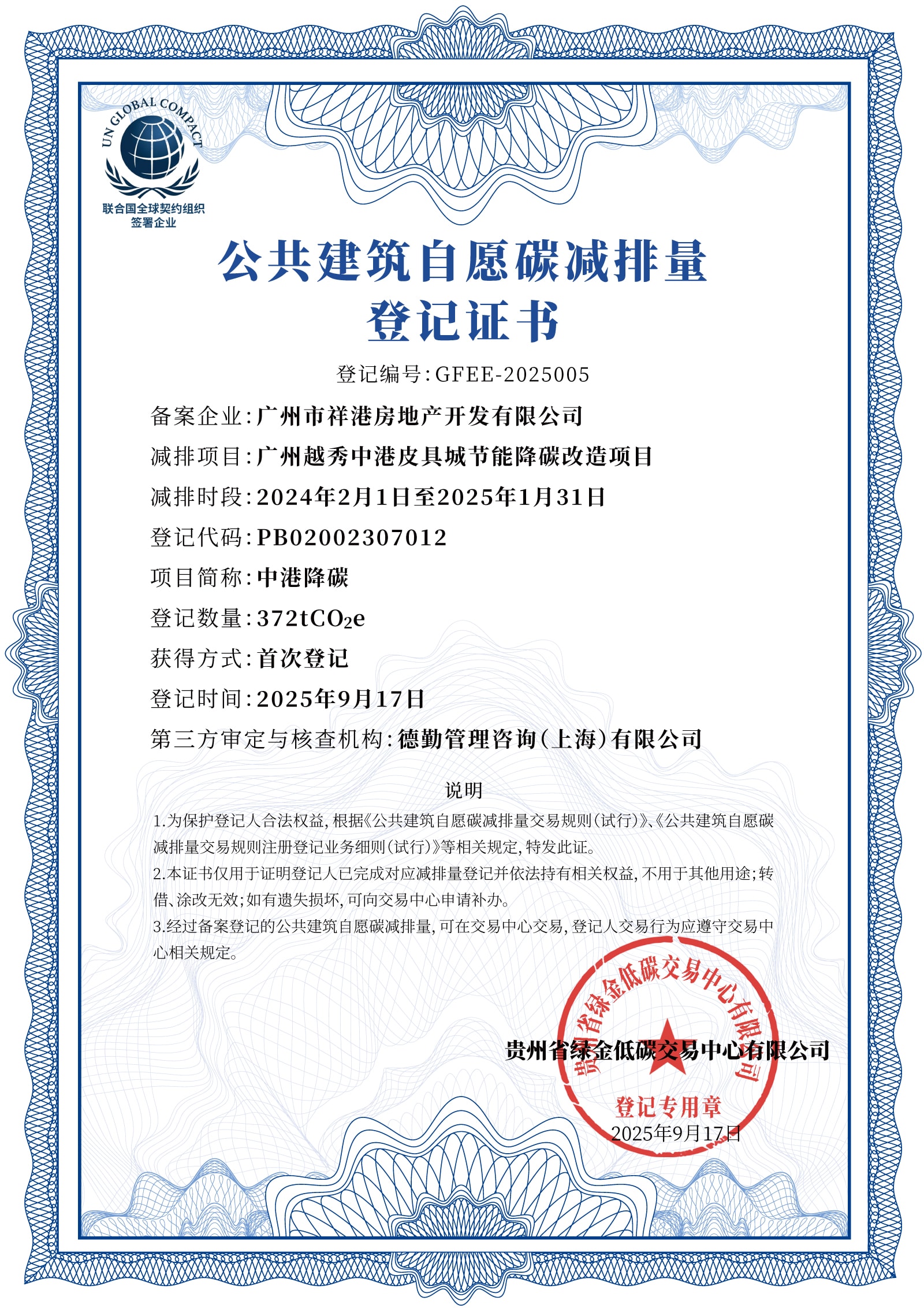 图:越秀・中港皮具城项目自愿碳减排量登记证书