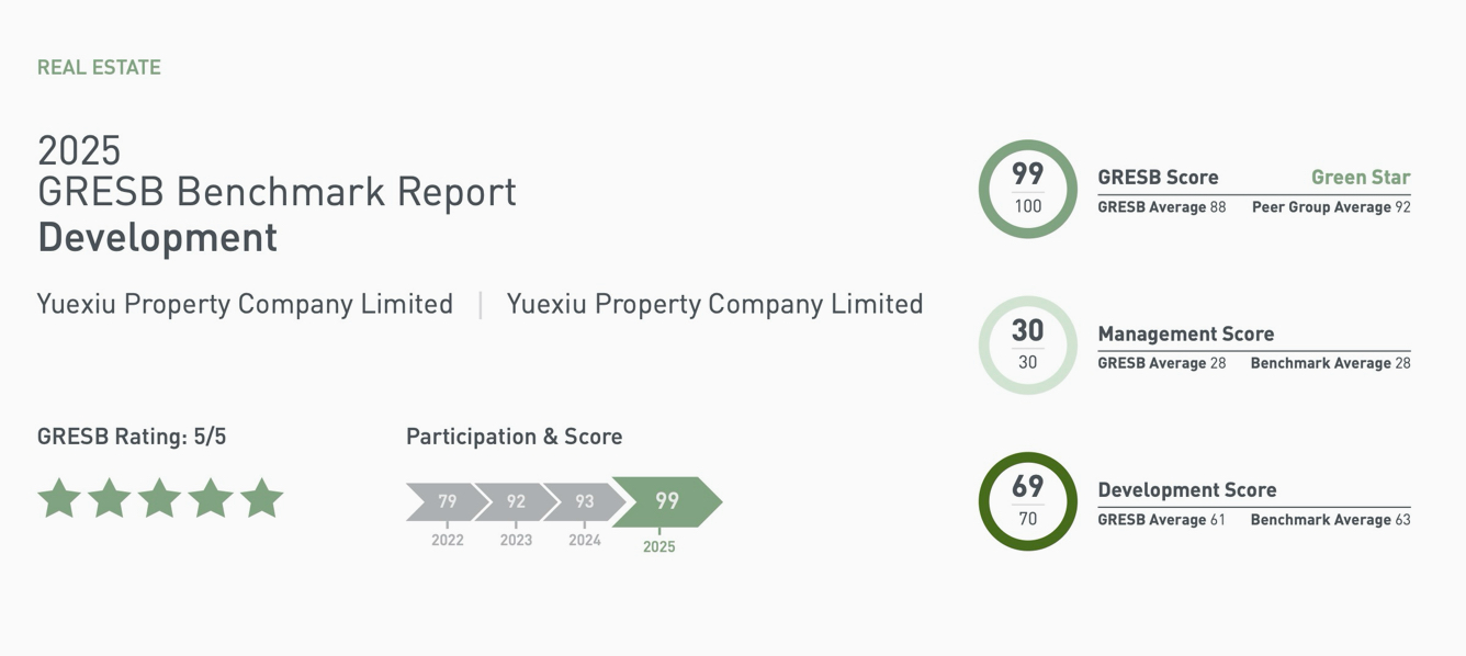 本次在国际权威可持续发展评级体系中斩获优异成绩,是对越秀地产环境、社会及治理(ESG)管理体系与实践成果的高度肯定,充分彰显了公司在环境治理、社会责任履行及企业治理等多维度的卓越综合表现,更是公司长期秉持可持续发展理念、积极落实可持续发展行动所达成的重要里程碑。